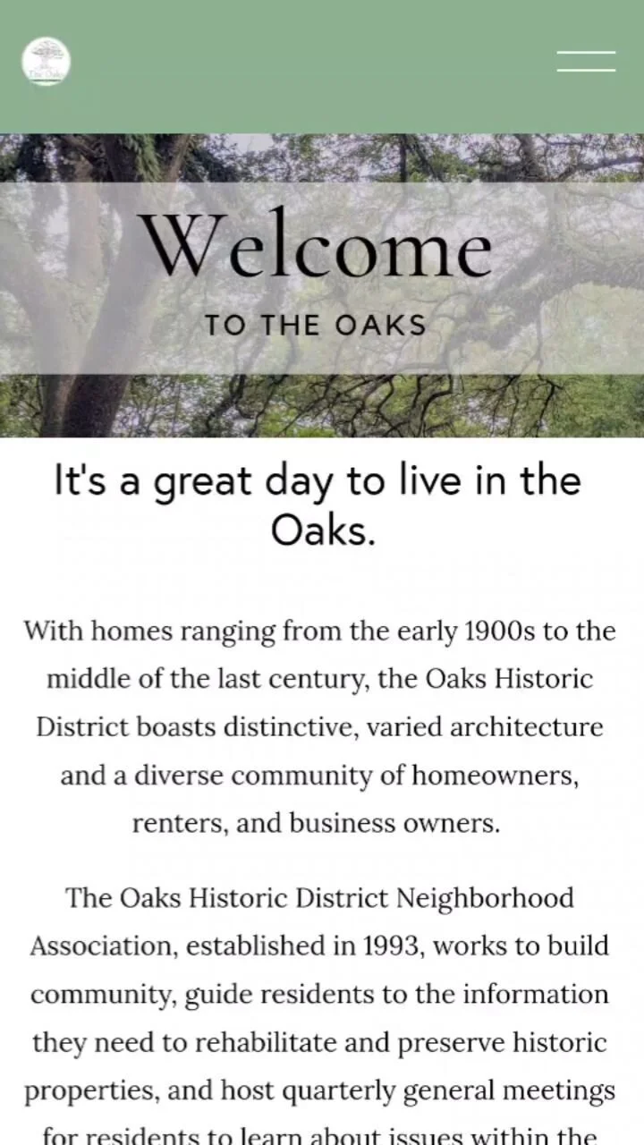 The Oaks Historic District Neighborhood Association, established in 1993, works to build community, guide residents to the information they need to rehabilitate and preserve historic properties, and host quarterly general meetings for residents to learn about issues within the neighborhood as well as upcoming events. The Oaks Historic District Neighborhood Association is a way for residents to get involved and get to know their neighbors.